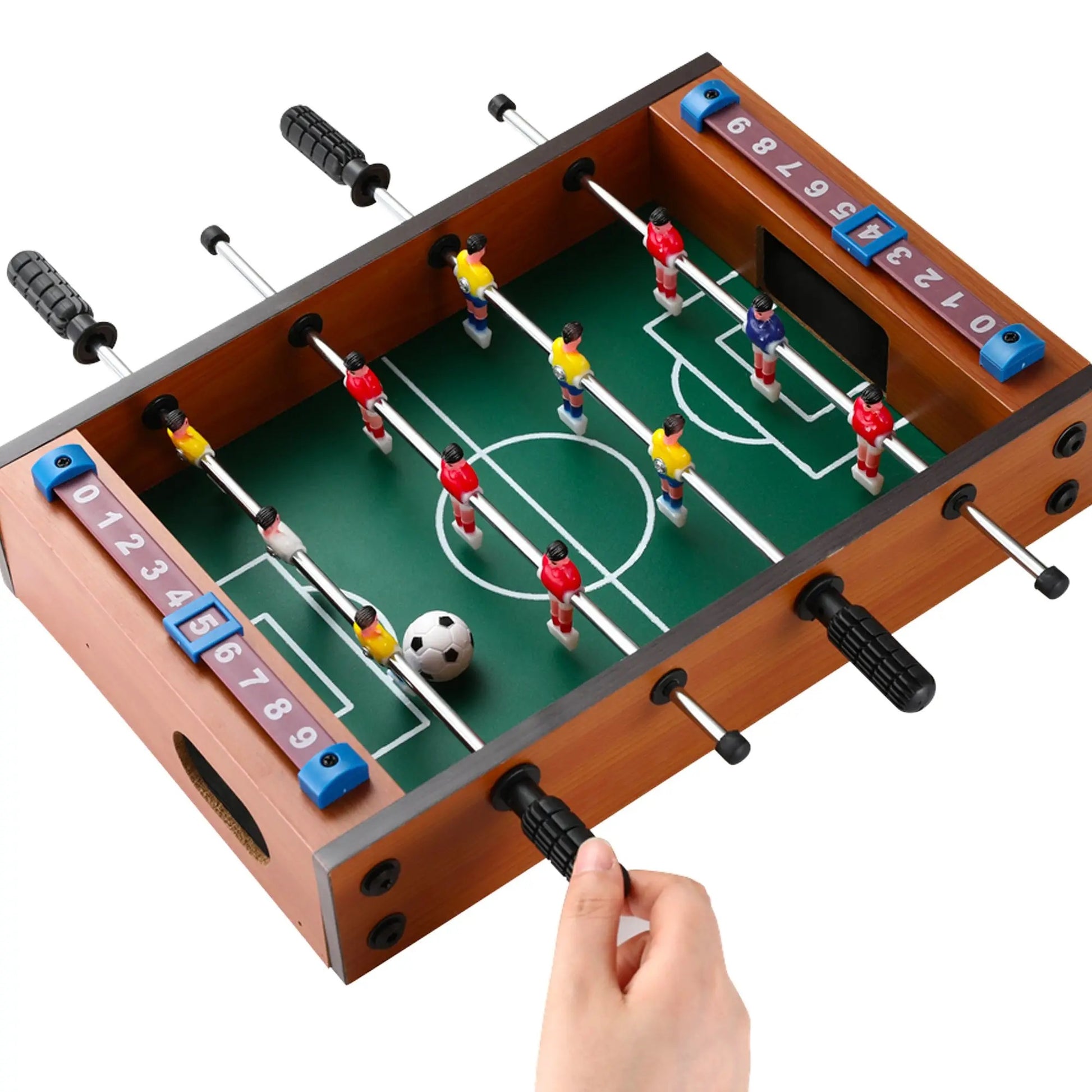 Includes wooden game table, players, balls, scorekeeper, and easy ball return.